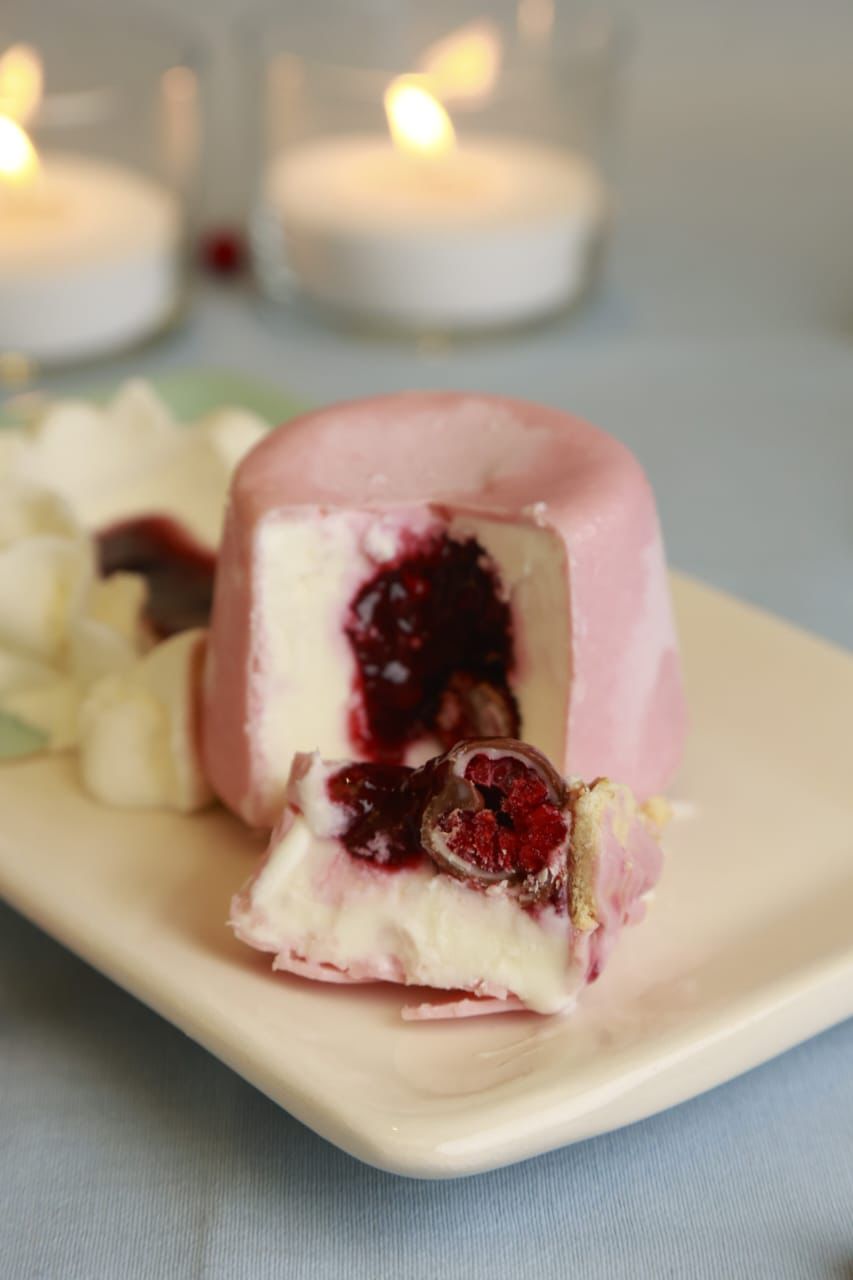 Corazón de confitura de frambuesas, con frambuesa entera en el centro.